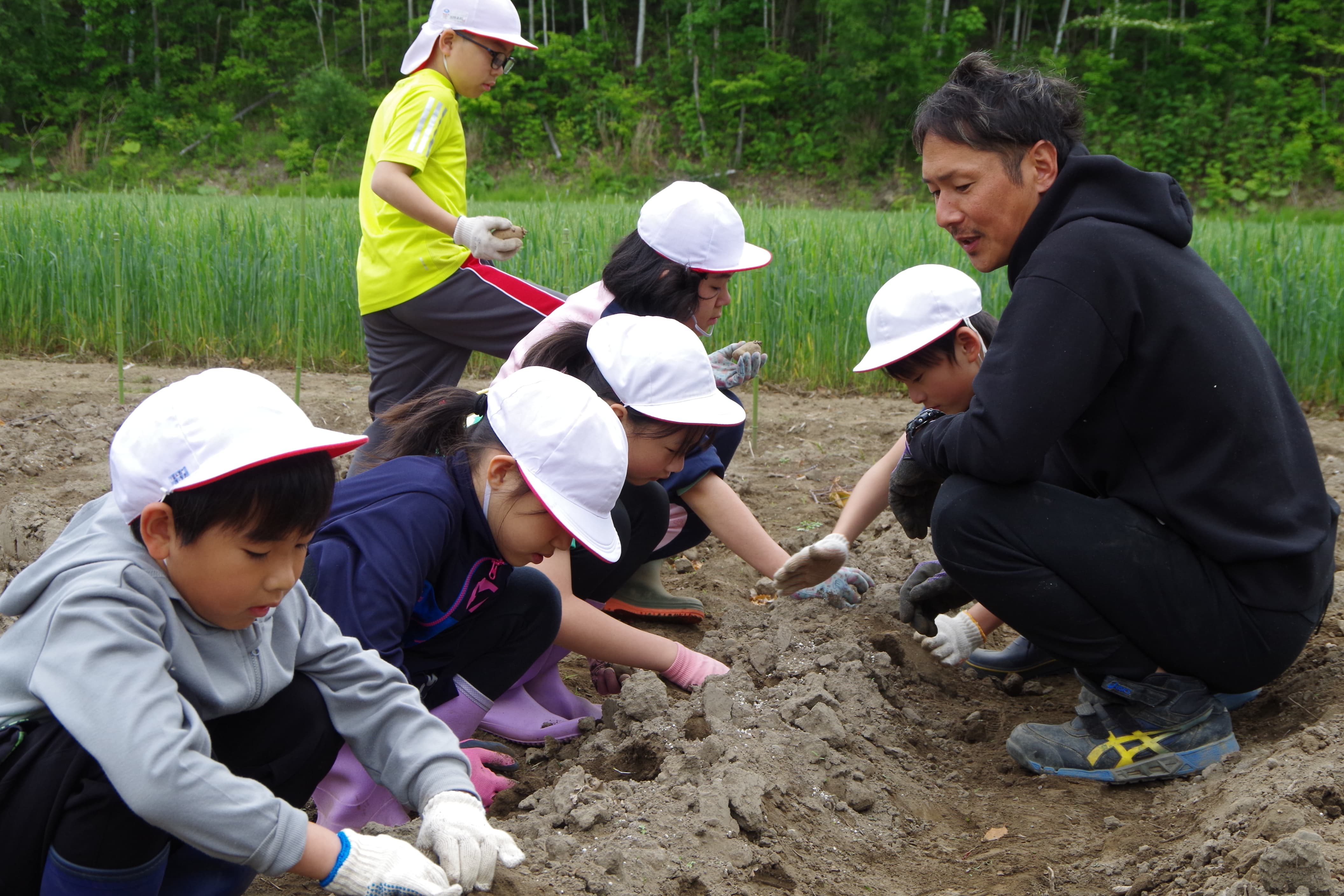 6月12日(月)に,ジャガイモの培土の方法を畑の先生に教えていただきました。最初は難しそうにしたり,ジャガイモの葉を刈ってしまったりしていた子どもたちも徐々に慣れ,最後は上手に土を盛り上げることができました。