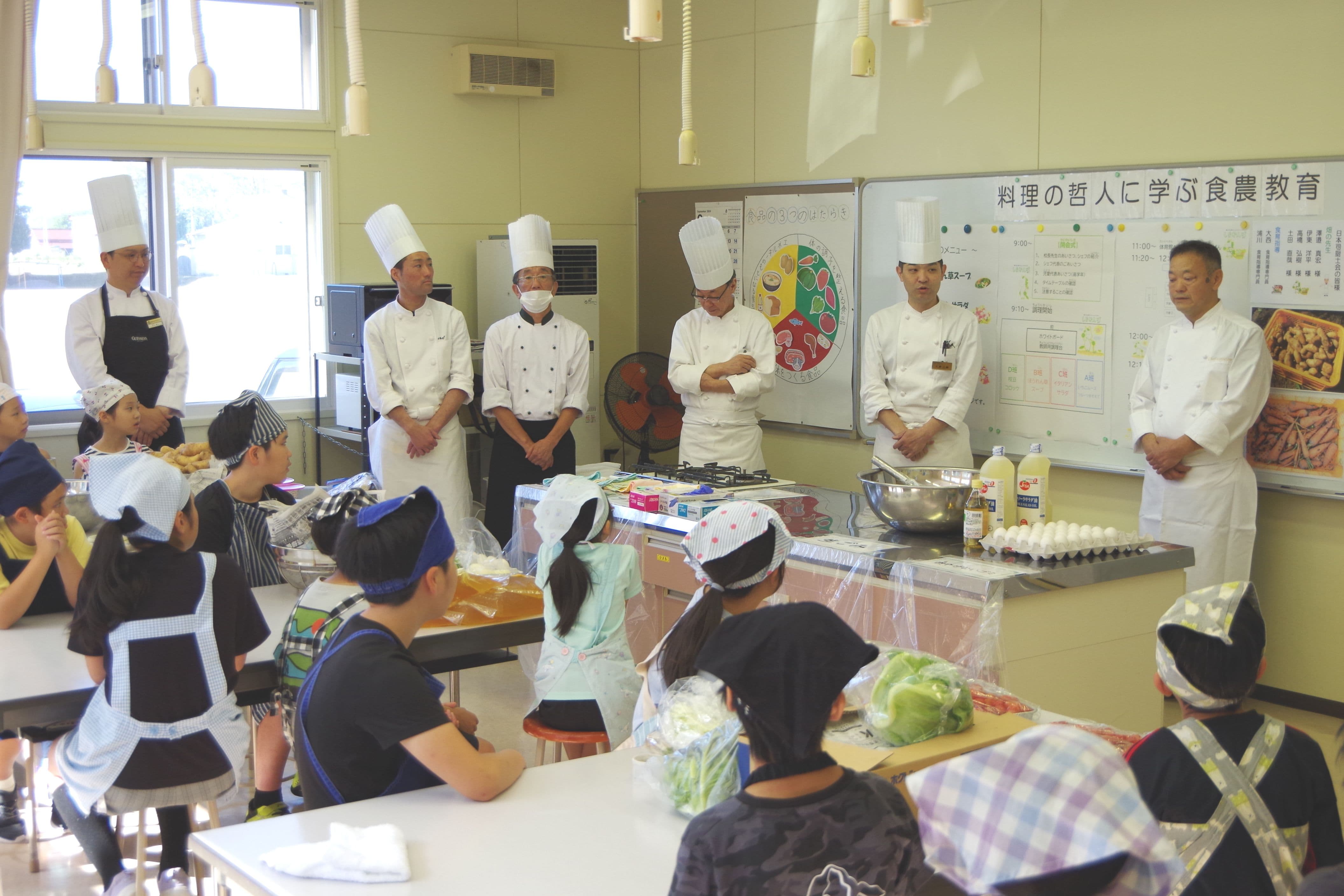 全国司厨士協会帯広支部の皆様のご協力を得て、あぐり活動(食農教育)を進めています。一流シェフの方々に助言をいただき、子どもたちが収穫祭でつくる料理と、それに必要な野菜を決め、学校農園で栽培します。