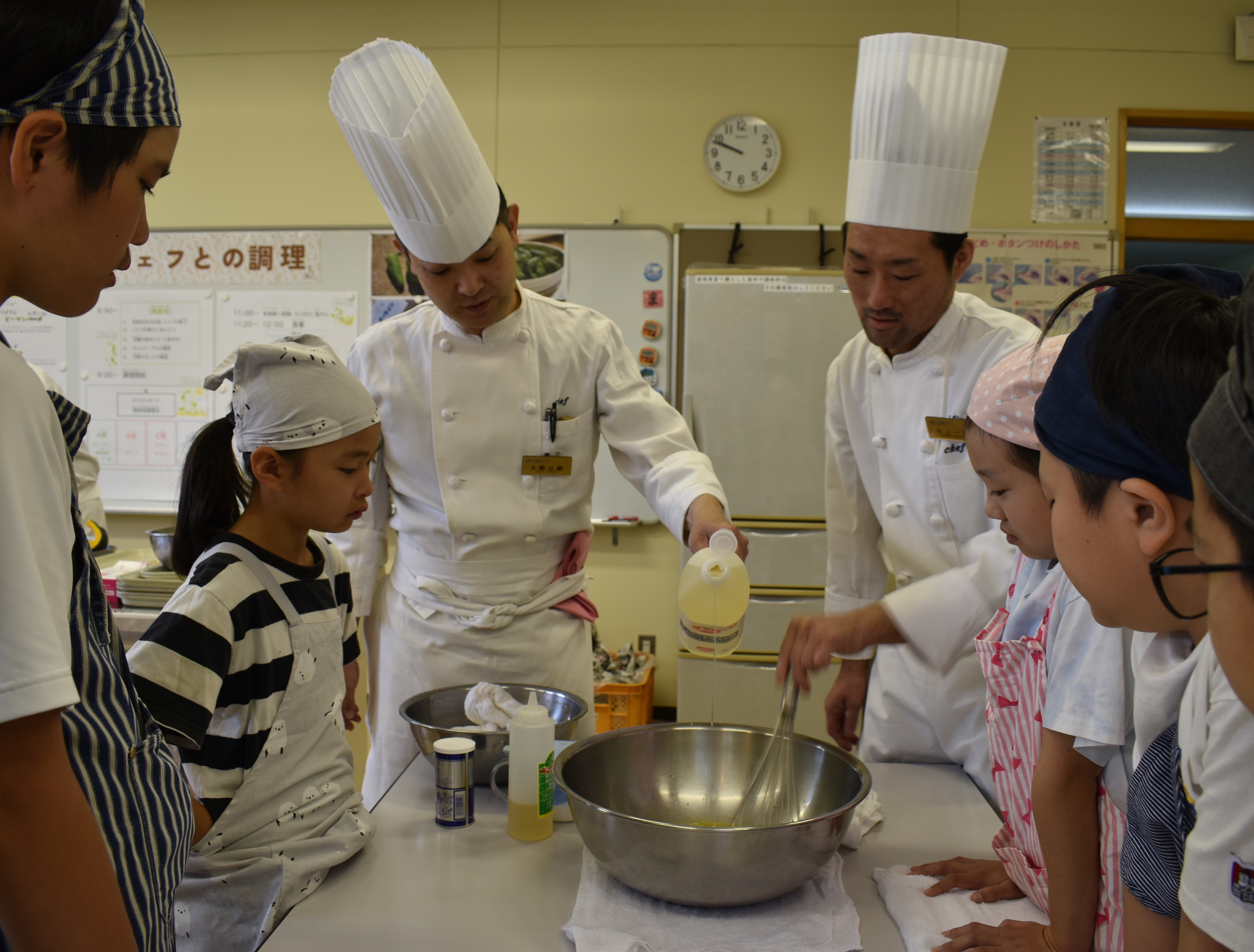 6月20日(火),シェフの皆さんが来校され,子どもたちに地場産食材のランチを作ってくださいました。料理と子どもたちへの愛情が深く感じられる皆さんの立ち振る舞いから,たくさんの学ぶことがありました。すごいスピードで繰り広げられるプロの技にお母さん方もビックリ。